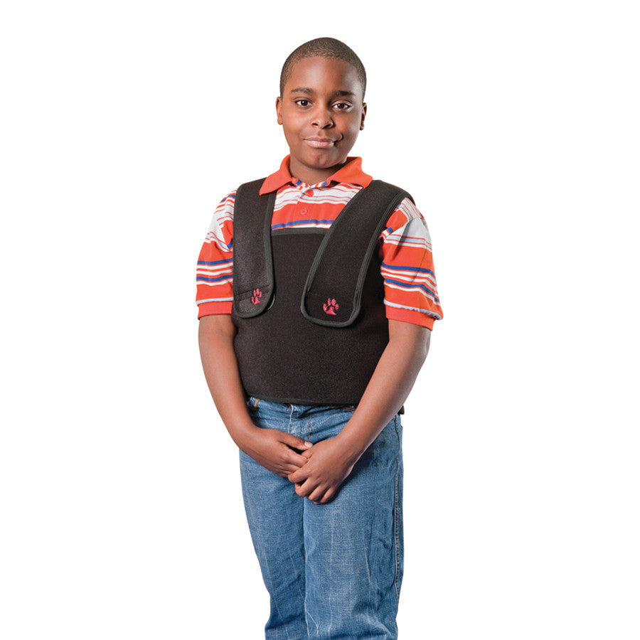 Give your clients the sensation of a big bear hug with our deep pressure vest, the BearHug Vest. Children with proprioceptive and tactile integration dysfunction will benefit from the sensory feedback they receive when wearing the vest. Can be used for calming to help the oversensitive child decrease hyperresponsiveness.The vest consists of one adjustable body wrap and two adjustable shoulder straps, and is cold-water washable.